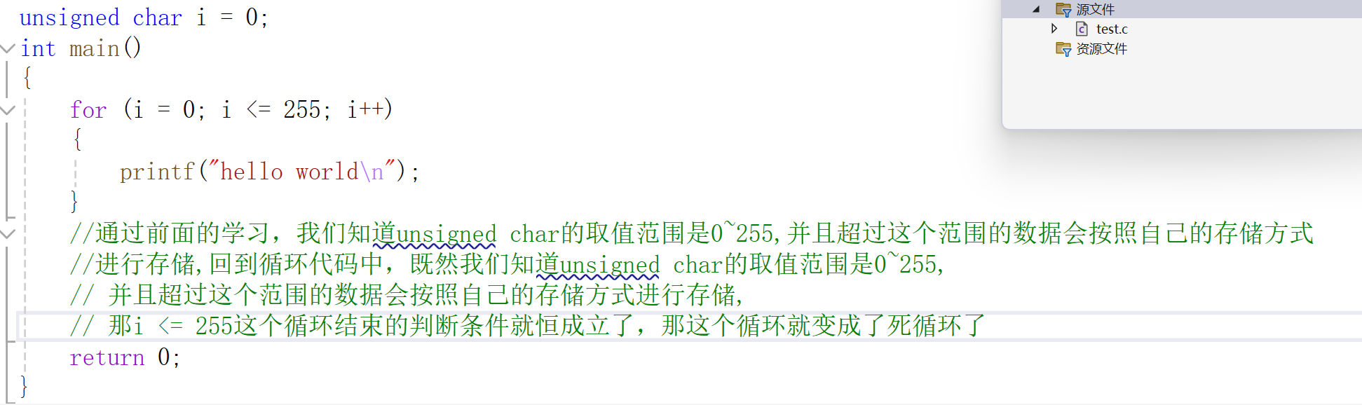 }通过前面的学习,我们知道unsigned char的取值范围是0~255,并且超过这个范围的数据会按照自己的存储方式,进行存储,回到循环代码中,既然我们知道unsigned char的取值范围是0~255,并且超过这个范围的数据会按照自己的存储方式进行存储,那i <= 255这个循环结束的判断条件就恒成立了,那这个循环就变成了死循环了。
