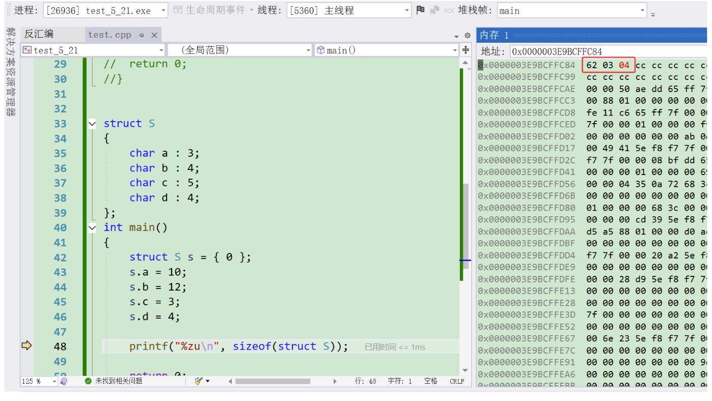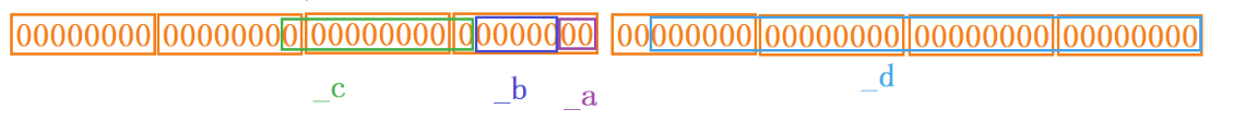 我们知道a占2个比特位,b占5个比特位,c占10个比特位,d占30个比特位,加起来一共是47个比特位,6个字节是48个比特位,很明显是可以存下47个比特位的,但编译器给我们的结果却是8,这就说明存在空间浪费,剩余的空间不能满足下一个成员的时候,vs编译器认为这些空间需要被浪费,那这样的话,a,b,c一共是17个比特位就需要申请4个字节,d占30个比特位需要再申请4个字节的空间,这样就达到了8个字节的空间。
