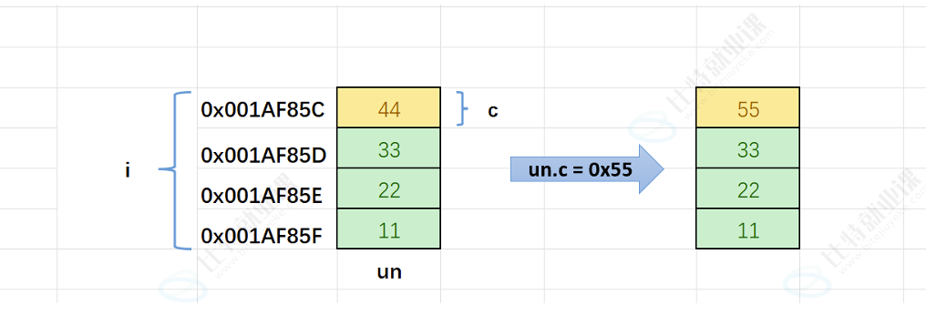 }上面代码中的 u.c 是拿出第一个字节,1在内存中的地址是以16进制形式打印,1的地址是00 00 00 01,1如果以小端字节序存储的话,那就是01 00 00 00;大端字节序存储就是00 00 00 01,然后我们进行判断是否等于1,如果等于1(16进制的01也是1),那就是小端字节序存储,如果等于0,那就是大端字节序存储。