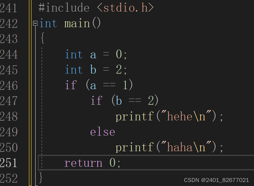 我们实际上是希望if(a==1)与else匹配的,但这样写就会造成if(b==2)与else匹配,所以运行结果就会什么都没打印。