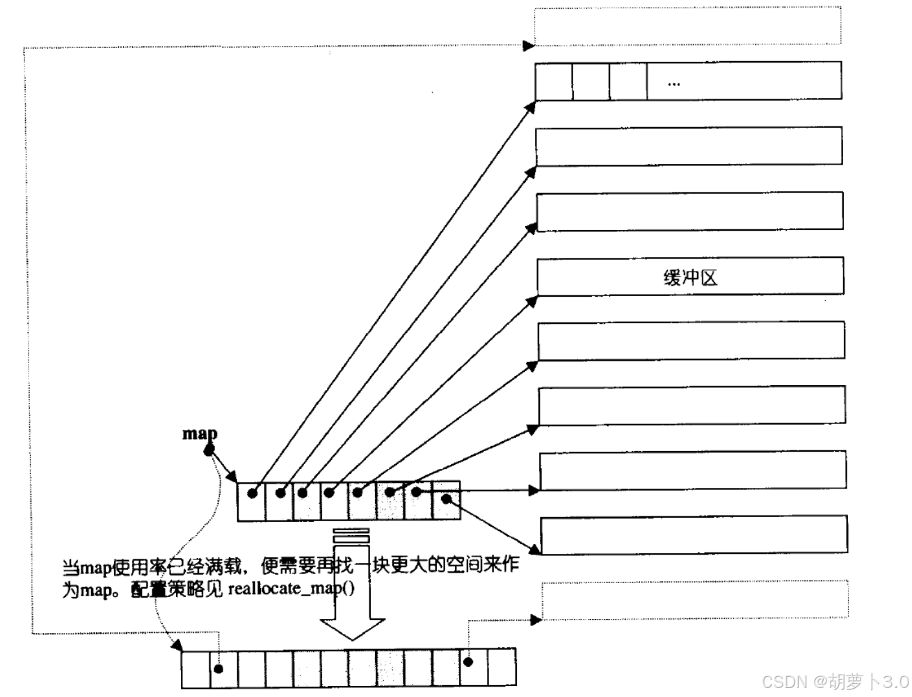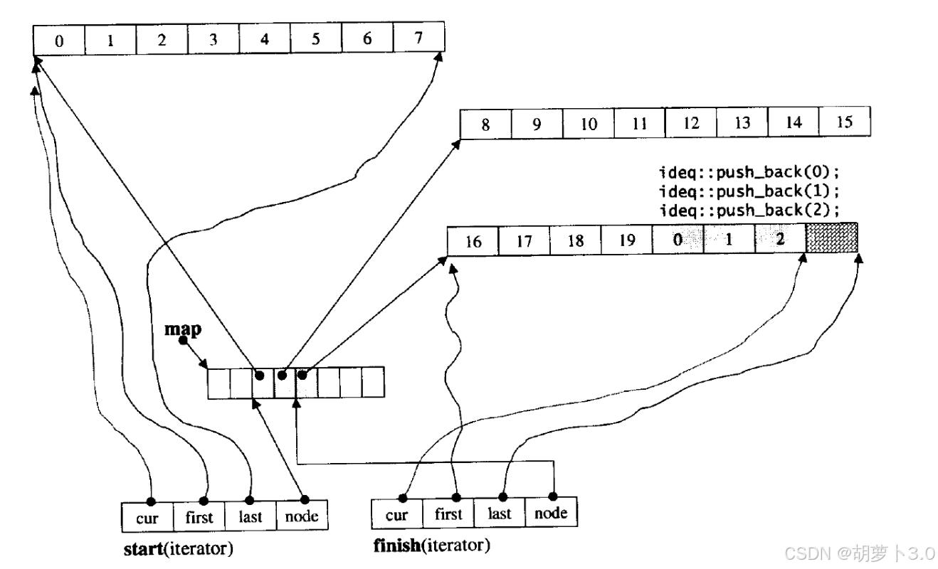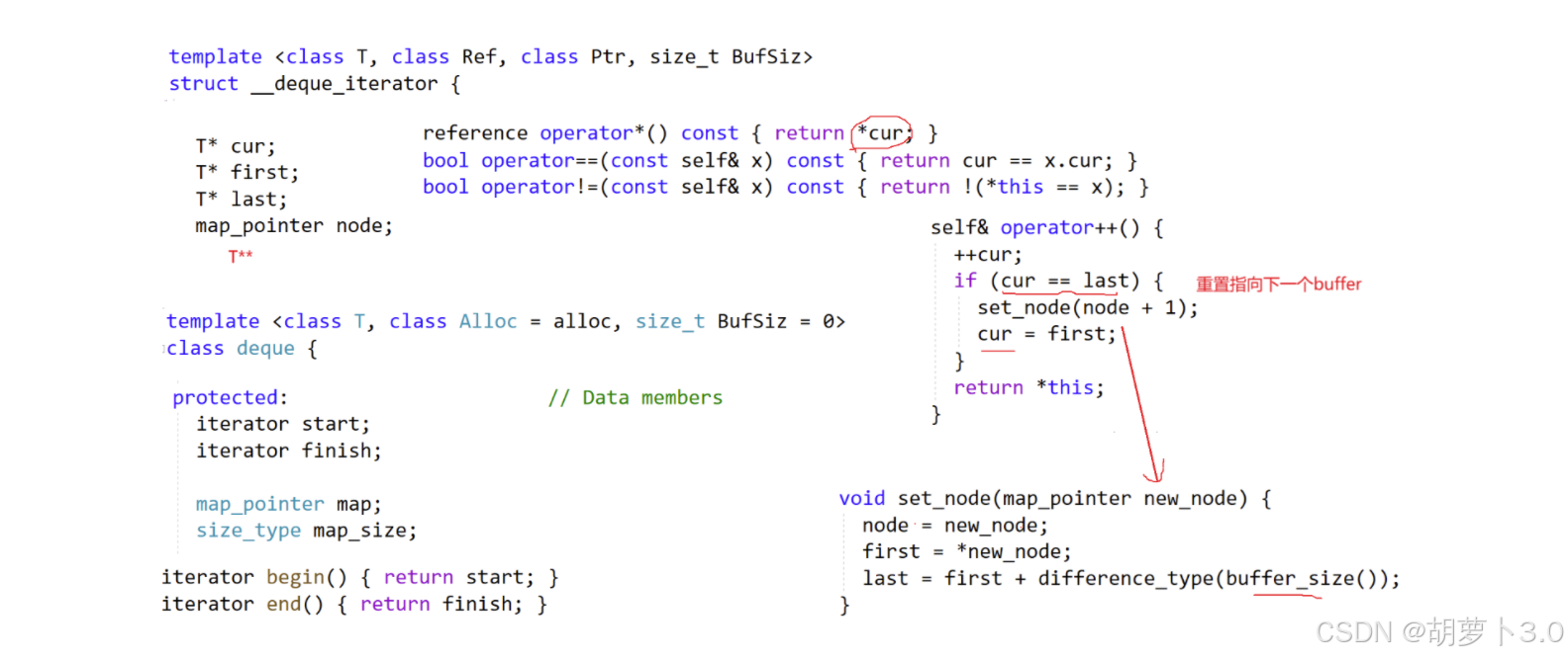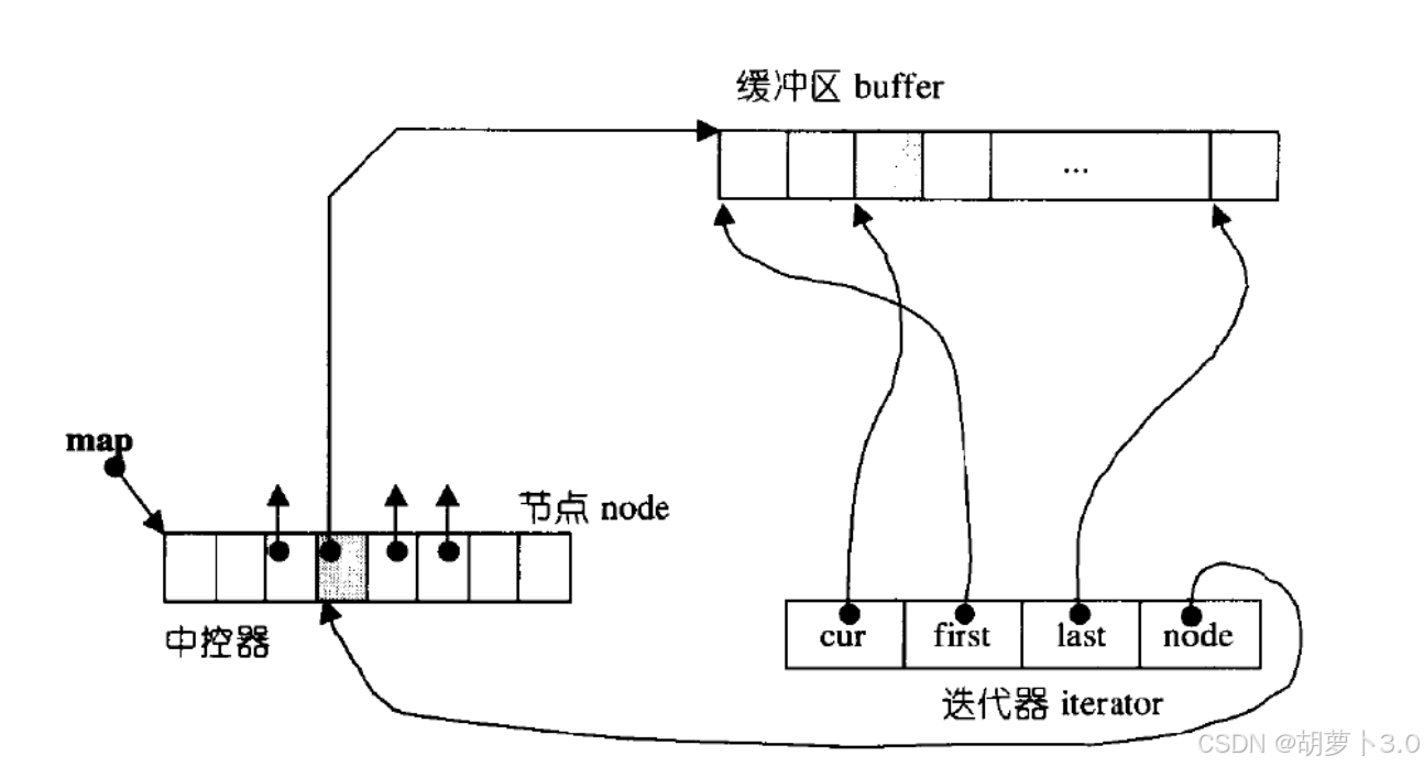 当迭代器从一个缓冲区的末尾(cur == last)移动到下一个元素时,会通过 node 找到下一个缓冲区的地址,再将 cur 指向新缓冲区的 first,从而实现 “跨缓冲区连续访问” 的效果。
