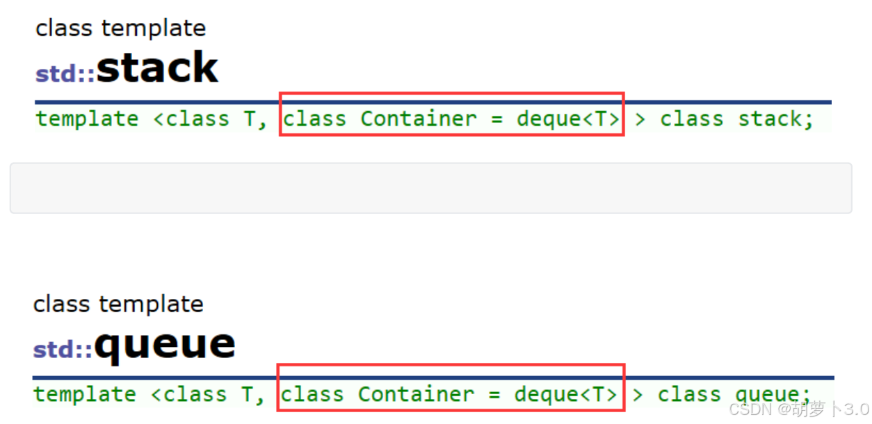 虽然stack和queue中也可以存放元素,但在STL中并没有将其划分在容器的行列,而是将其称为容器适配器,这是因为stack和队列只是对其他容器的接口进行了包装,STL中stack和queue默认使用deque,比如: