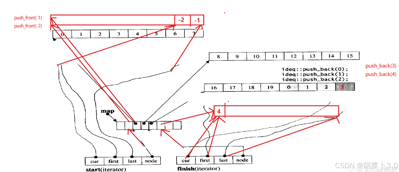 迭代器的 “衔接” 作用: deque 的迭代器是实现 “伪连续” 的关键,它内部包含四个核心成员: