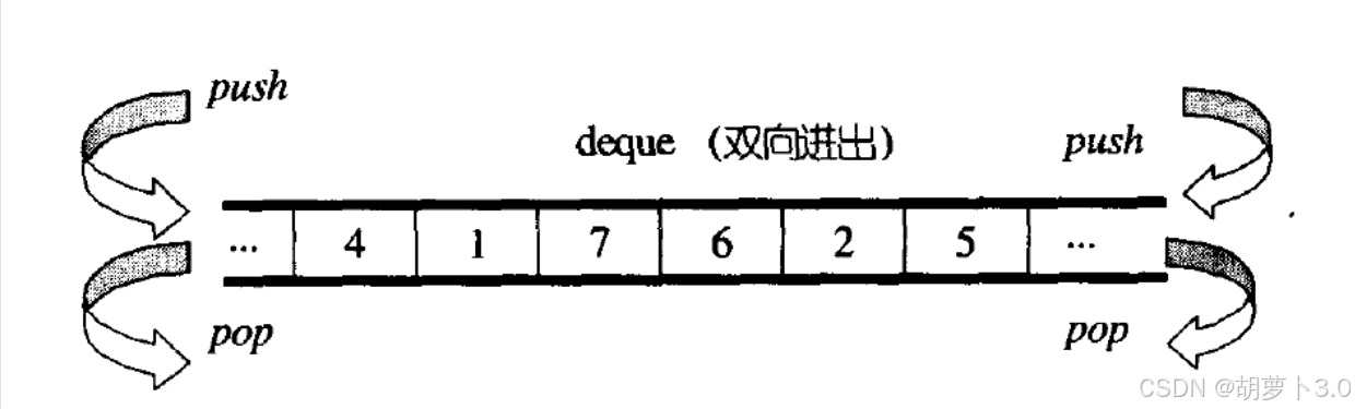deque(双端队列):是一种双开口的"连续"空间的数据结构,双开口的含义是:可以在头尾两端进行插入和删除操作,且时间复杂度为O(1),与vector比较,头插效率高,不需要搬移元素;与list比较,空间利用率比较高。