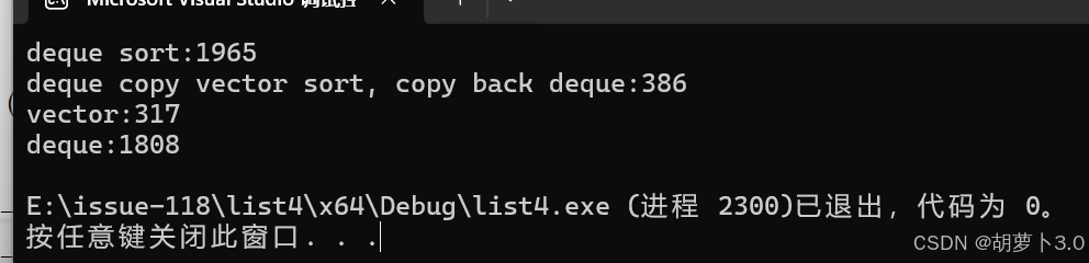 printf("deque copy vector sort, copy back deque:%d\n", end2 - begin2);