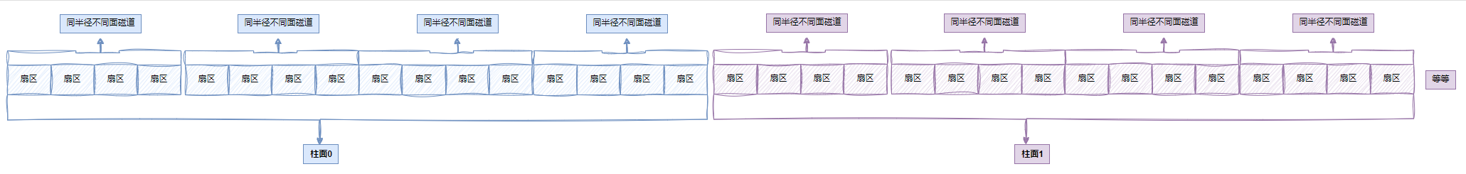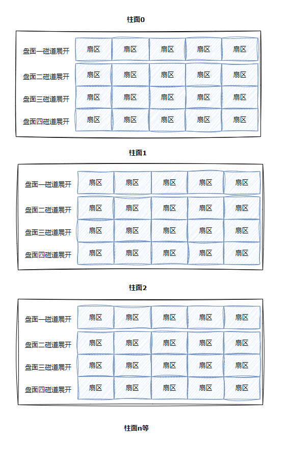 那么磁盘本质上虽然是硬质的,但是逻辑上我们可以把磁盘想象成为卷在一起的磁带,那么磁盘的逻辑存储结构我们也可以类似于: