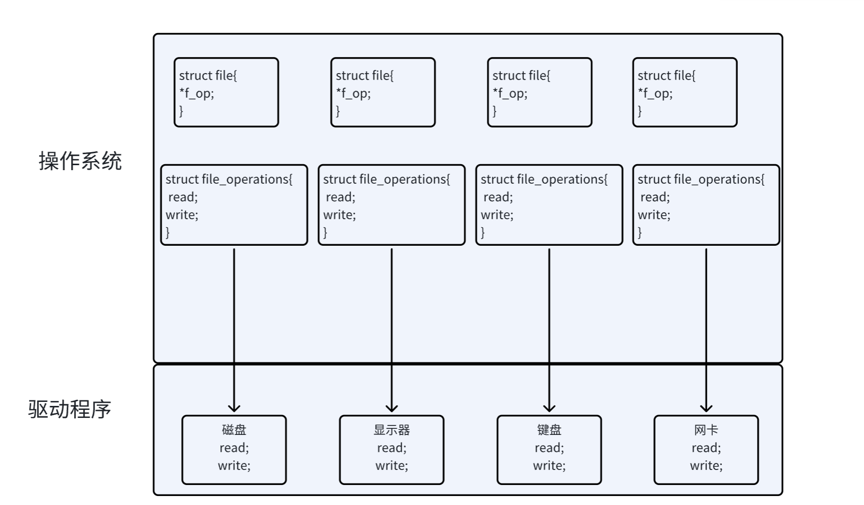 上图中的外设,每个设备都可以有自己的read、write,但一定是对应着不同的操作方法!!但通过struct file 下 file_operation 中的各种函数回调,让我们开发者只用file便可调取 Linux 系统中绝⼤部分的资源!!这便是“linux下一切皆文件”的核心理解。