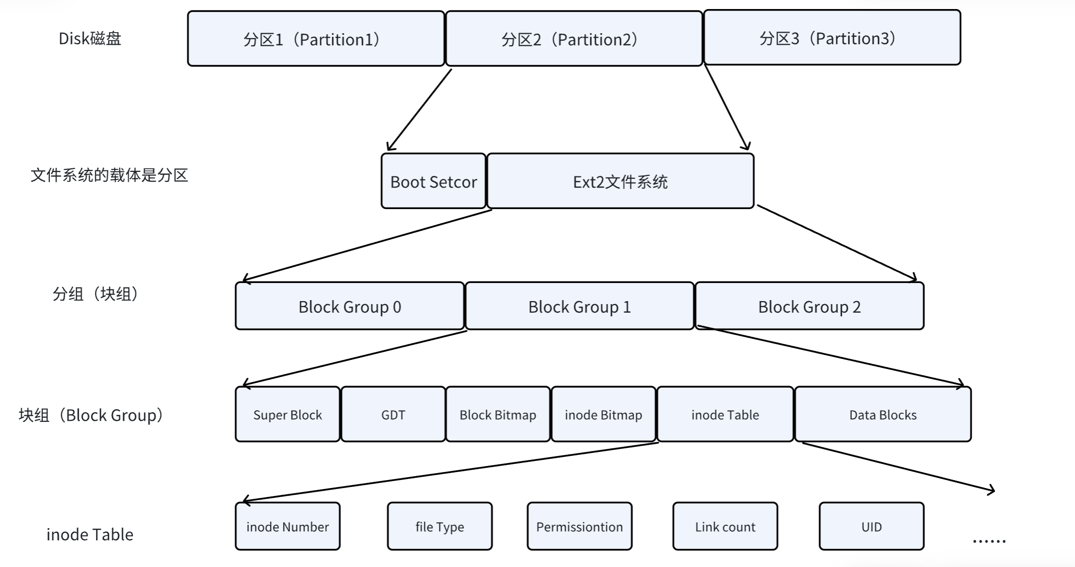 上图中启动块(Boot Block/Sector)的大小是确定的,为1KB,由PC标准规定,用来存储磁盘分区信息和启动信息,任何文件系统都不能修改启动块。启动块之后才是ext2文件系统的开始。