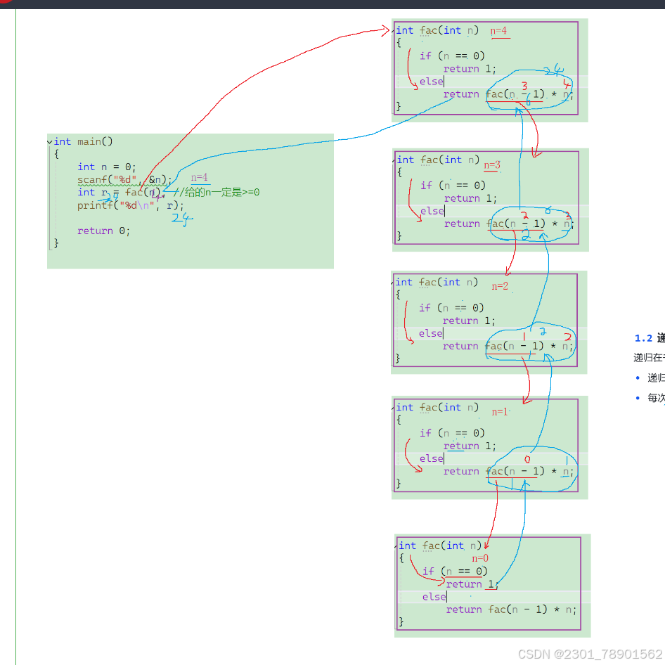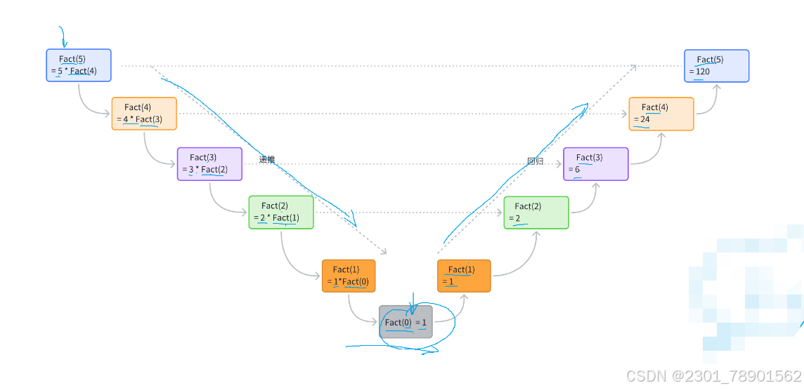 n的阶乘和n-1的阶乘是相似的问题,但是规模要少了n。有⼀种有特殊情况是:当 n==0 的时候,n的阶乘是1,⽽其余n的阶乘都是可以通过上⾯的公式计算。 这样我们就把把⼀个较⼤的问题,转换为⼀个与原问题相似,但规模较⼩的问题来求解