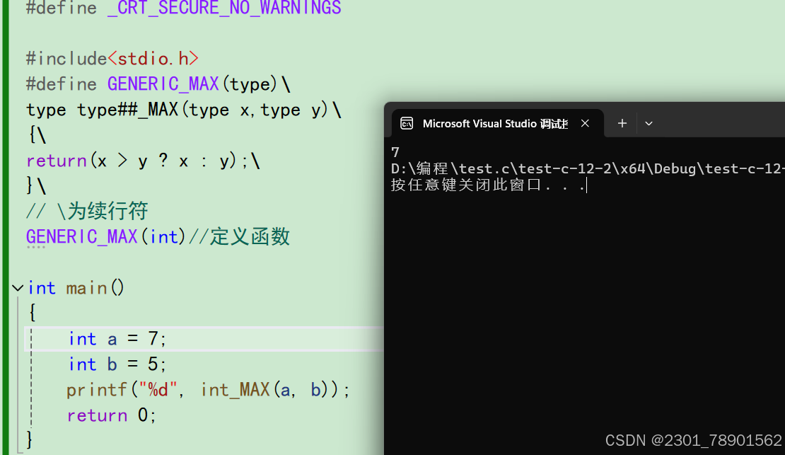这里我们就是把type和MAX合并成了一个函数名,如果未使用##运算符其中的type_MAX不会理解为int_MAX,而是理解为type_MAX。实际上我们很少用到#操作符和##操作符,但是当我们看到#操作符和##操作符时要知道这是什么意思。