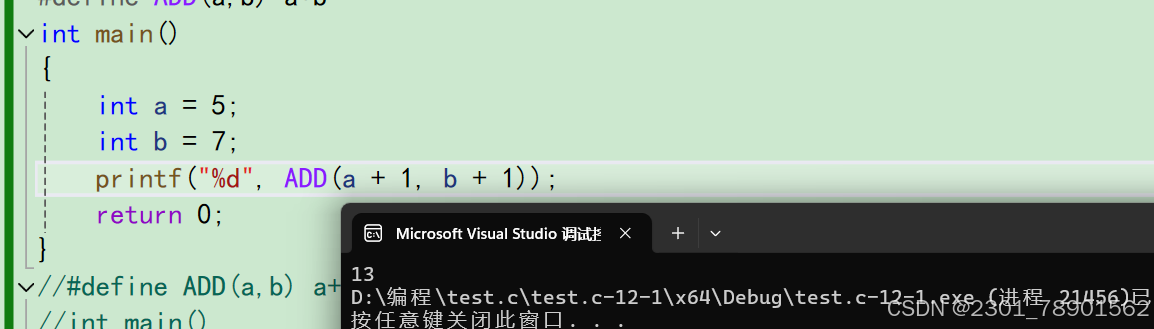 从输出结果上来看,这个结果很令人出乎意料我们想得到6*7的结果,那为什么结果是13呢?这就要了解一下宏/定义宏的运行原理:其实,我们在把两个参数传过去后,(其原理是将参数在不计算的情况下直接传参传参过去)计算的其实是5+1*3+1,根据运算法则,,先算乘法再算加法,所以输出结果为13。