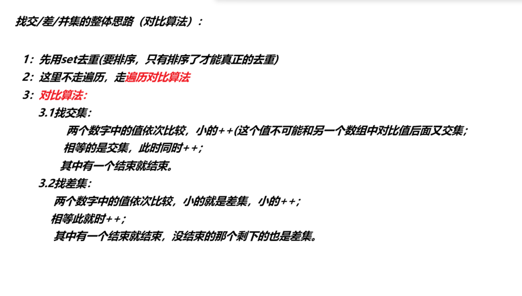 两个数组中找交/差/并集的整体思路(对比算法):