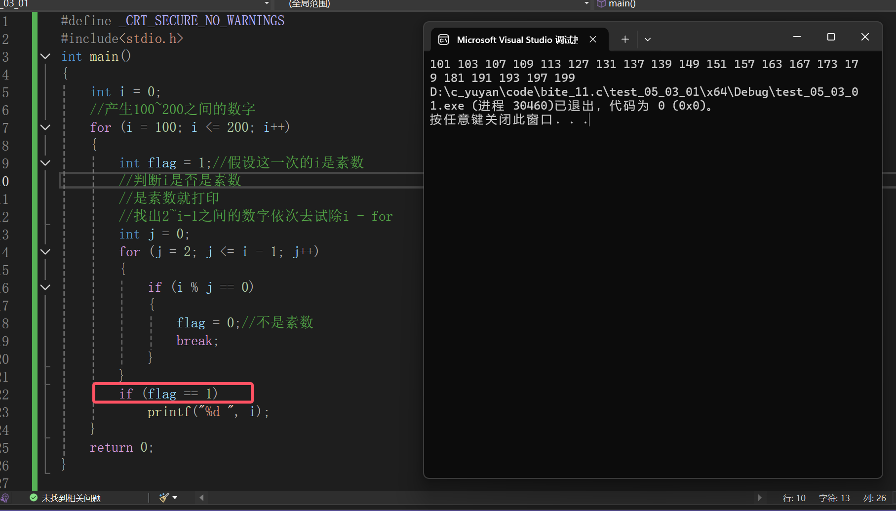 大部分的代码解析都在图中注释里,这里就不作过多解释。当i等于101的时候,j等于2,内部循环开始,j从2到100依次与101试除,如果可以整除的时候,便不是素数,flag等于0,跳出break循环,不打印。如果不可以整除101,j变为3到100,依次与101试除,最后发现都不能整除,里面if的判断就不成立,程序走到外部的if(flag==1);打印出101。后面i等于102重复上面的流程。这里break的作用是如果能提前找到一个j整除i,就能跳出内部循环,更快嘛,就比如说i是100,j等于2的时候就可以整除了,flag直接变为0了,就不用后面3到99依次与100试除了,节省步骤时间。而且可以看到,当flag=0的时候,就执行下一步break,跳出循环,不打印。
