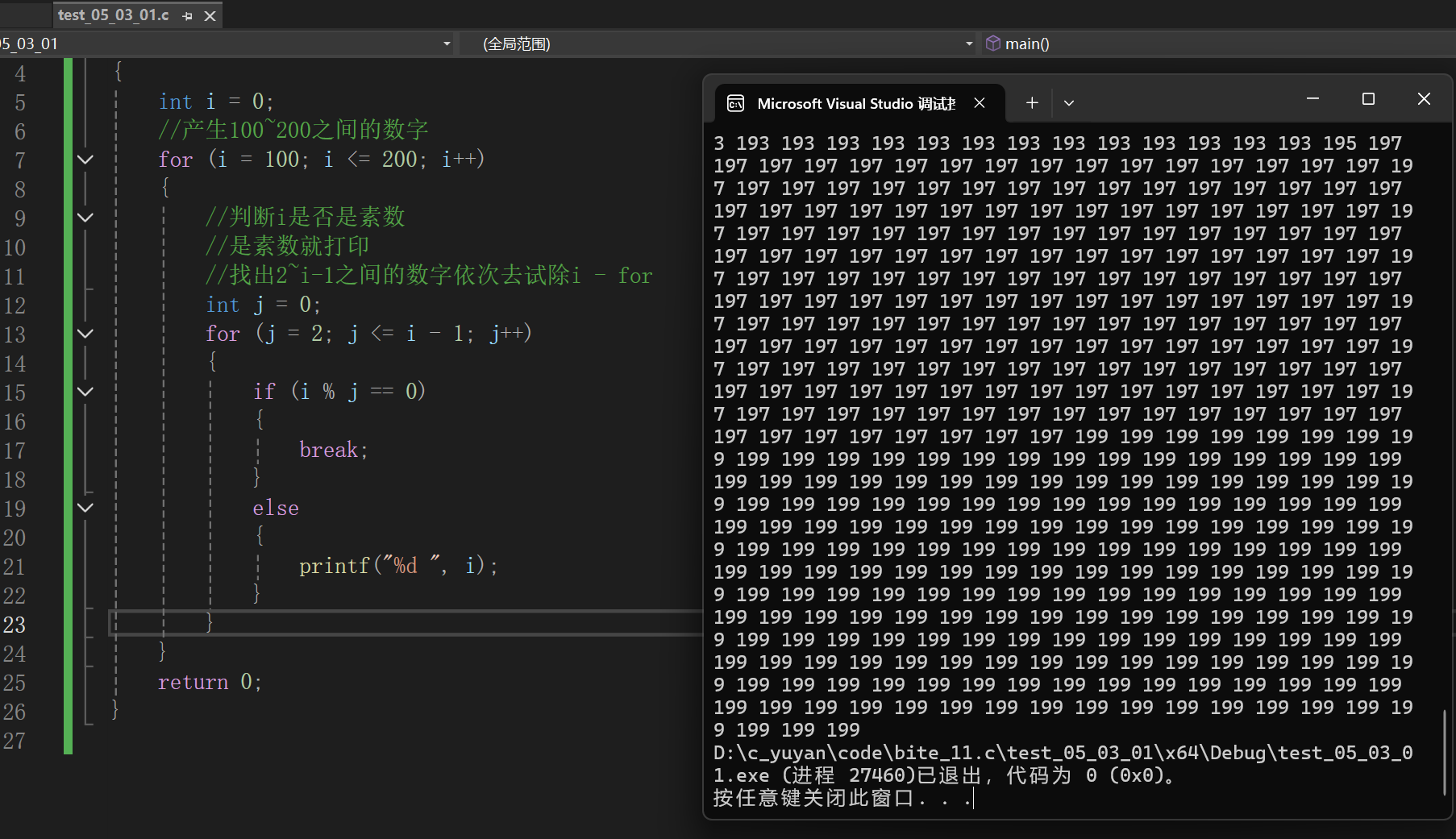 我么们这里判断100是不是素数,for循环产生2-99的数字,这里发现2已经能够整除100了,说明100不是素数,break先跳出来,后面的3呀4呀一直到99呀都不用试除了,break就来到了//1。还有一种情况break没有被执行,当i等于101,就要用2到100的数字试除它,发现没有任何一个数字能够整除101,这里break就不执行了,当j等于101的时候,j<=i-1就不成立了就跳出来了,也会走到//1 2那里,这里就需要区分出来了,因为break满足跳到那里是 不是素数的情况,而j<i-1跳到那里是 是素数的情况,所以就有了外部循环printf这串代码。