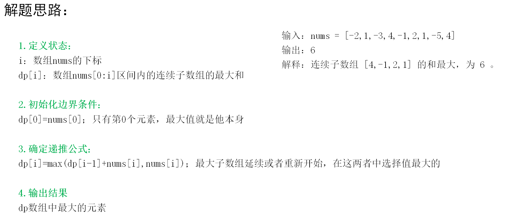 1 <= nums.length <= 105-104 <= nums[i] <= 104本题求解的是最大子数组的和,要留意下,子数组是数组中的一个连续部分。我们可以通过动态规划来求解,此时可以套用动态规划的解题模板。