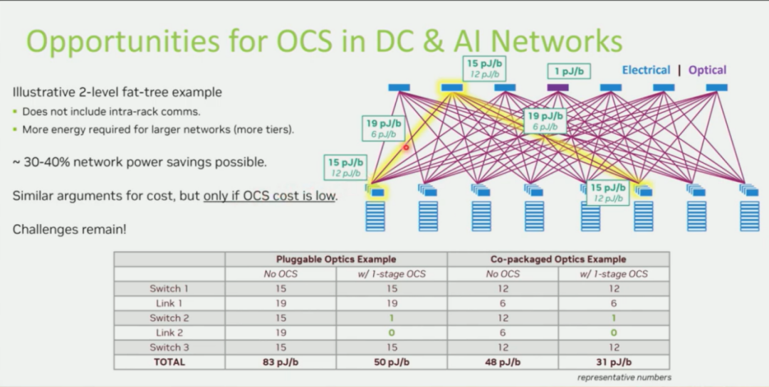 预计在2026-2028 年,CPO 技术将进入规模化商用阶段 。CPO 将光引擎直接封装在 GPU/TPU 的基板上,极大地缩短了电信号的传输距离(SerDes功耗降低 30% 以上),从而提高带宽密度。正如 Nvidia 在 OCP 峰会上通过数据模型所展示的(图4),在 CPO 时代引入 OCS,有望通过消除 spine层电交换机开销进而将网络能耗进一步降低 30%-40%。