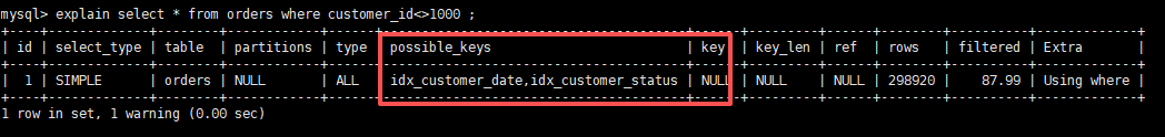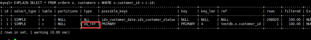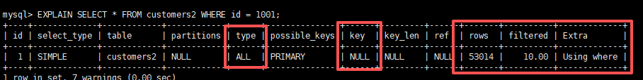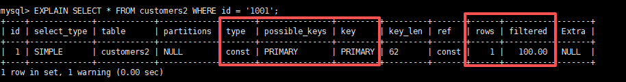 mysql> EXPLAIN SELECT * FROM customers2 WHERE id = '1001';