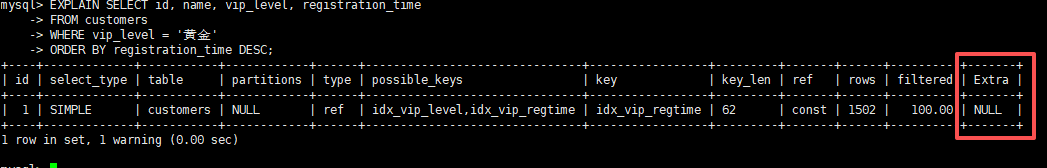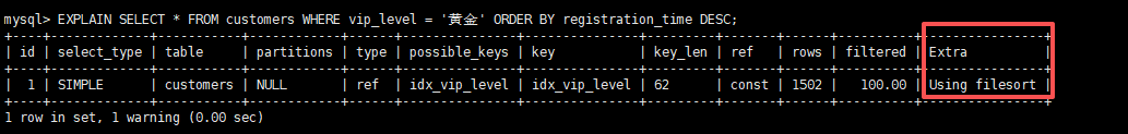 mysql> EXPLAIN SELECT * FROM customers WHERE vip_level = '黄金' ORDER BY registration_time DESC;