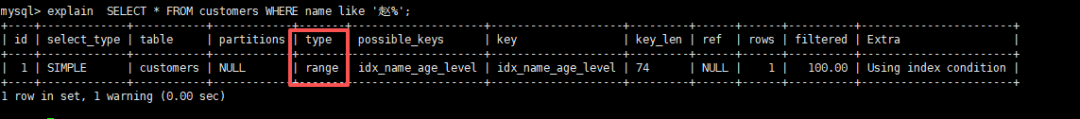 mysql> EXPLAIN SELECT * FROM customers WHERE name LIKE '张%';