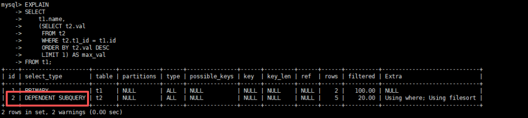 | 2 | DERIVED | NULL | NULL | NULL | NULL | NULL | NULL | NULL | NULL | NULL | No tables used |