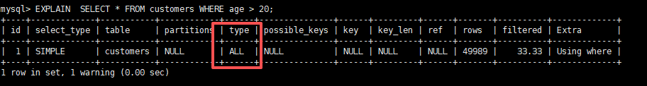 mysql> EXPLAIN SELECT * FROM customers WHERE age = 30;