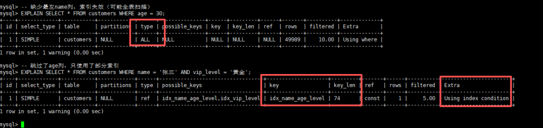 mysql> EXPLAIN SELECT * FROM customers WHERE name = '张三' AND vip_level = '黄金';