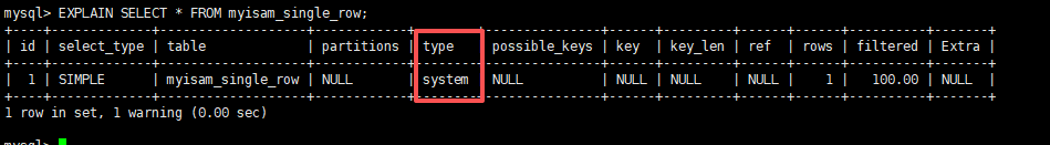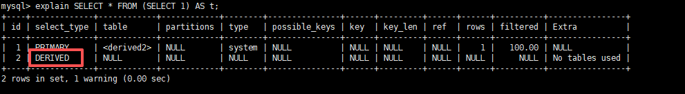 | 1 | PRIMARY | <derived2> | NULL | system | NULL | NULL | NULL | NULL | 1 | 100.00 | NULL |