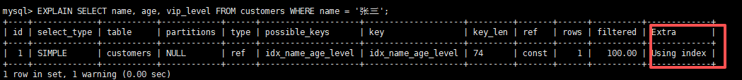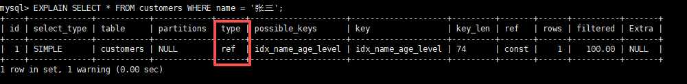 mysql> EXPLAIN SELECT name, age, vip_level FROM customers WHERE name = '张三';