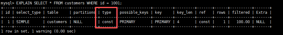 | 1 | PRIMARY | customers | NULL | const | PRIMARY | PRIMARY | 4 | const | 1 | 100.00 | NULL |