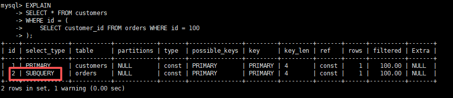 | 2 | SUBQUERY | orders | NULL | const | PRIMARY | PRIMARY | 4 | const | 1 | 100.00 | NULL |
