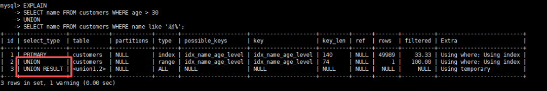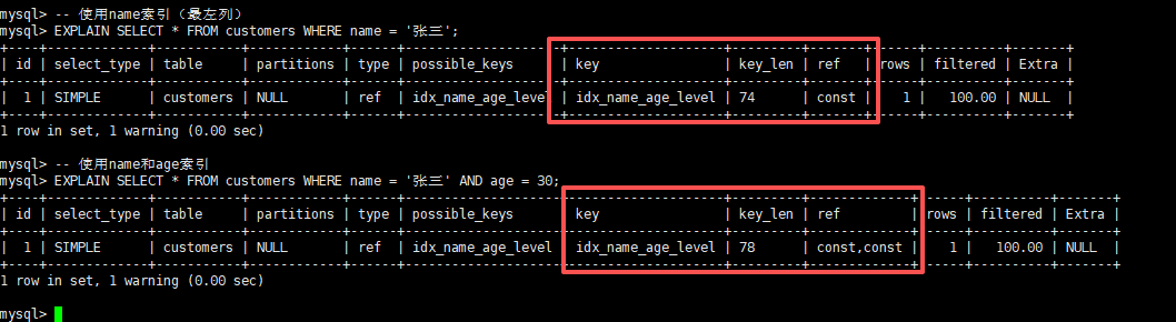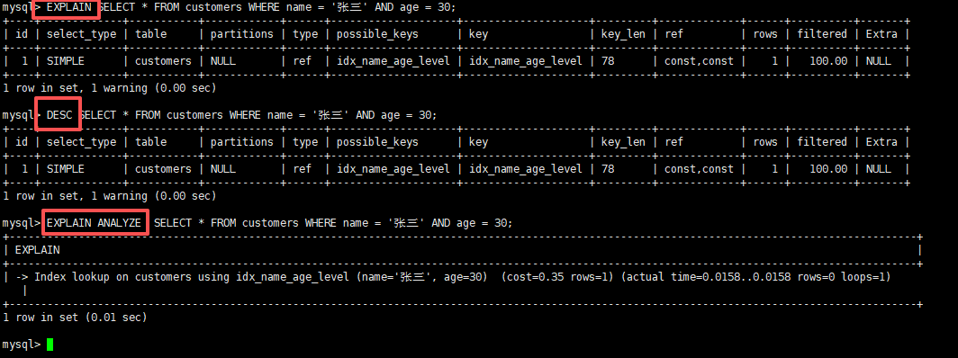 mysql> EXPLAIN SELECT * FROM customers WHERE name = '张三' AND age = 30;