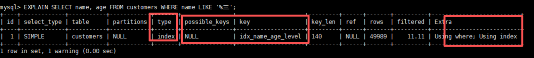 | 1 | SIMPLE | customers | NULL | index | NULL | idx_name_age_level | 140 | NULL | 49989 | 11.11 | Using where; Using index |
