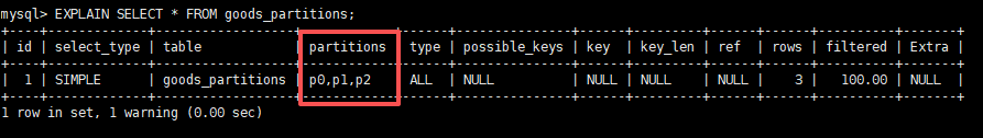 | id | select_type | table | partitions | type | possible_keys | key | key_len | ref | rows | filtered | Extra |