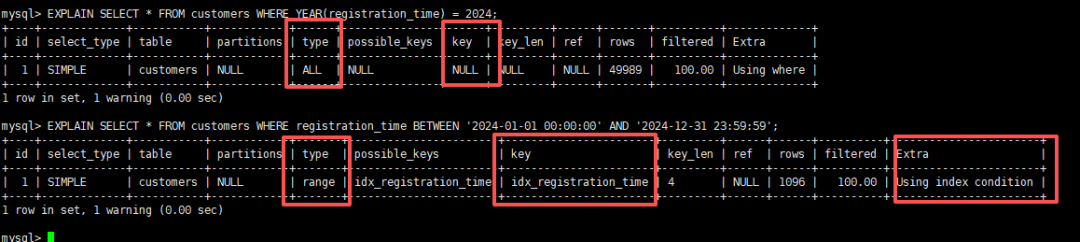 mysql> EXPLAIN SELECT * FROM customers WHERE registration_time BETWEEN '2024-01-01 00:00:00' AND '2024-12-31 23:59:59';