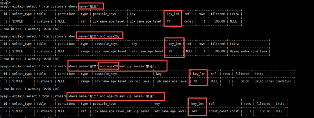 | 1 | SIMPLE | customers | NULL | ref | idx_name_age_level,idx_vip_level | idx_name_age_level | 74 | const | 1 | 5.00 | Using index condition |