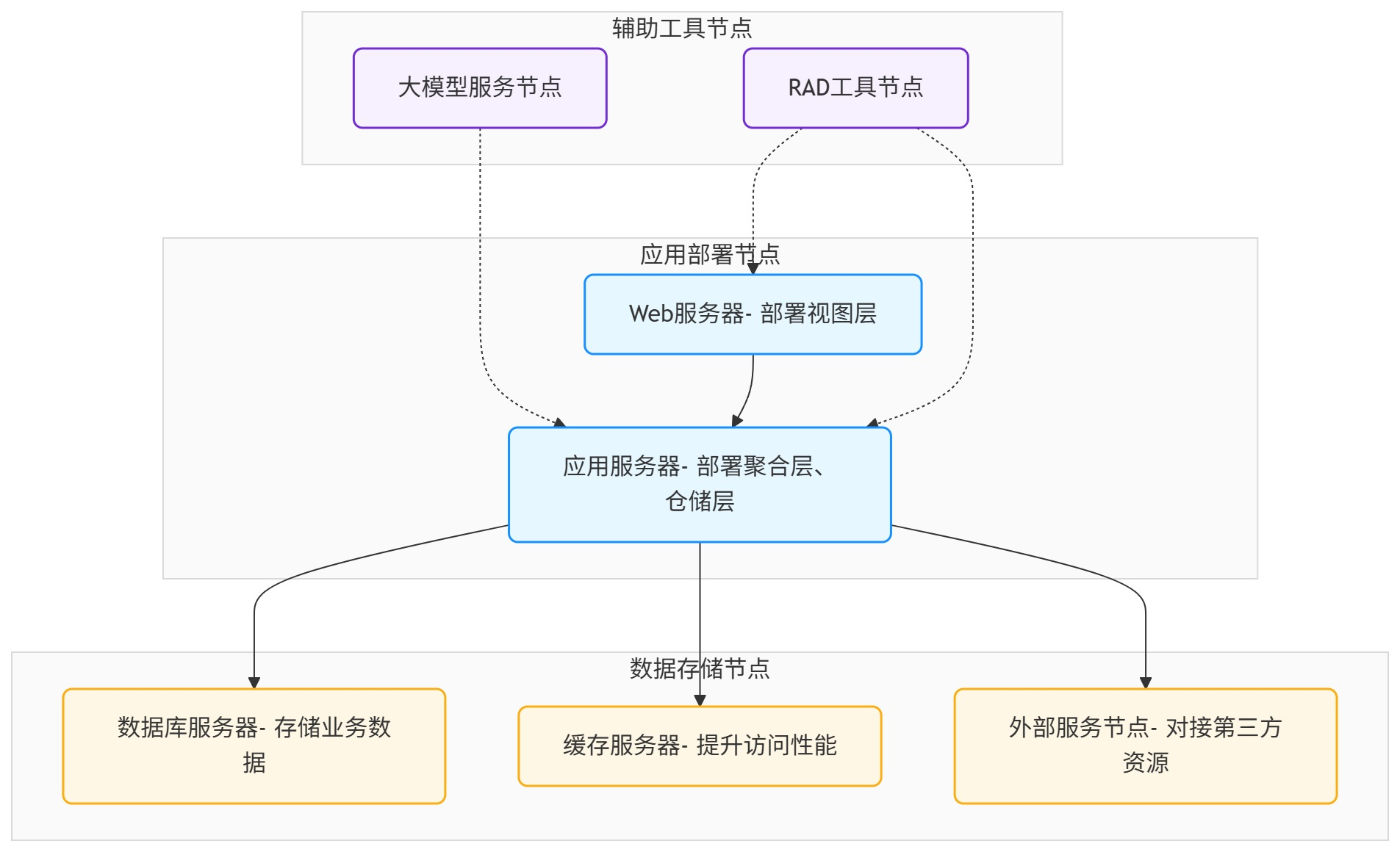 图形注解:1. 部署逻辑:视图层独立部署于Web服务器,聚合层与仓储层部署于应用服务器,数据层采用分布式存储节点,实现部署隔离与弹性扩展;2. 资源关联:应用服务器是核心枢纽,对接各类数据节点和辅助工具节点;3. 工具集成:大模型服务节点、RAD工具节点通过松耦合方式对接核心部署节点,不侵入业务核心,保障架构稳定性。