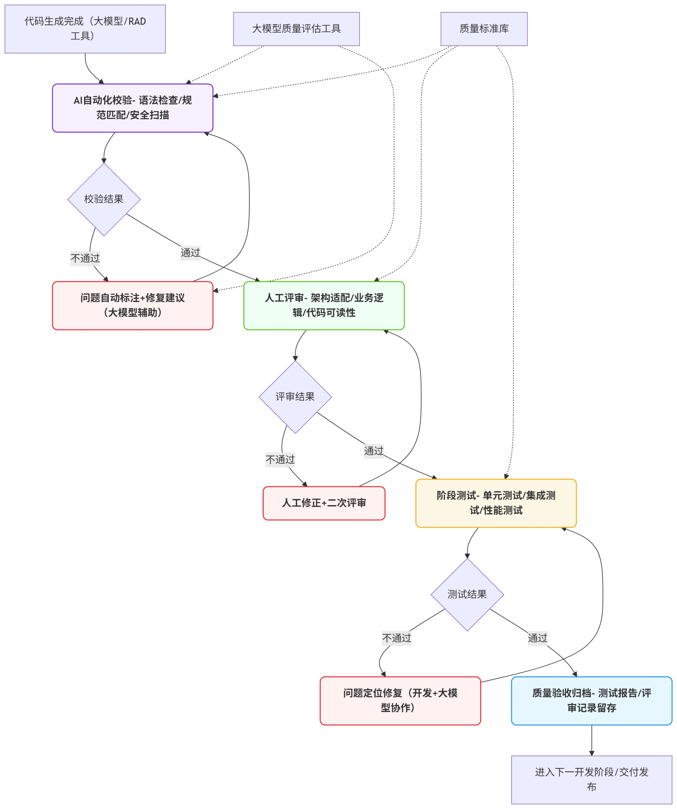 图形注解:1. 管控逻辑:采用“自动化前置校验+人工核心评审+阶段闭环测试”的全流程链路,确保质量问题早发现、早修复;2. AI赋能:大模型贯穿校验、修复建议、质量评估全环节,降低人工管控成本;3. 标准支撑:质量标准库为各环节提供统一判定依据,保障管控一致性;4. 闭环机制:各环节不通过项均需完成修复后重新校验,形成质量管控闭环。