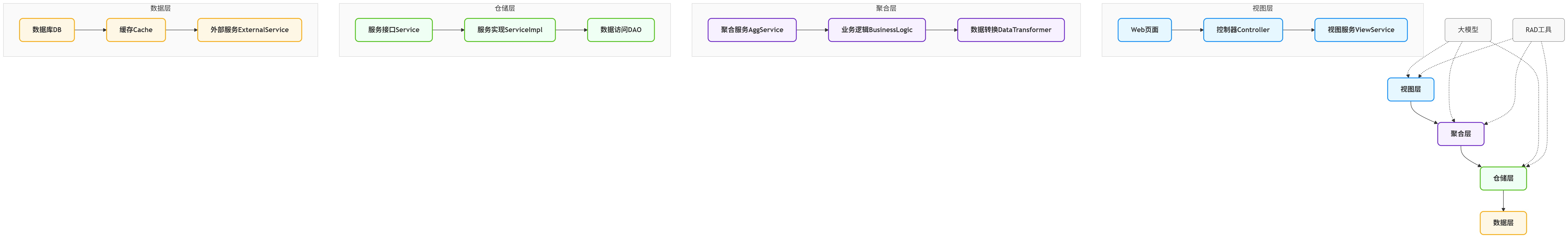 图形注解:1. 核心逻辑:自上而下的依赖关系,视图层接收用户请求,通过聚合层编排业务逻辑,由仓储层获取数据层资源,实现“展示-业务-数据”的完整链路;2. 层内组件:每个层级包含核心功能组件,明确各层的职责边界,确保高内聚低耦合;3. 设计目的:通过逻辑分层,使业务逻辑与数据访问分离,便于后续维护和迭代。