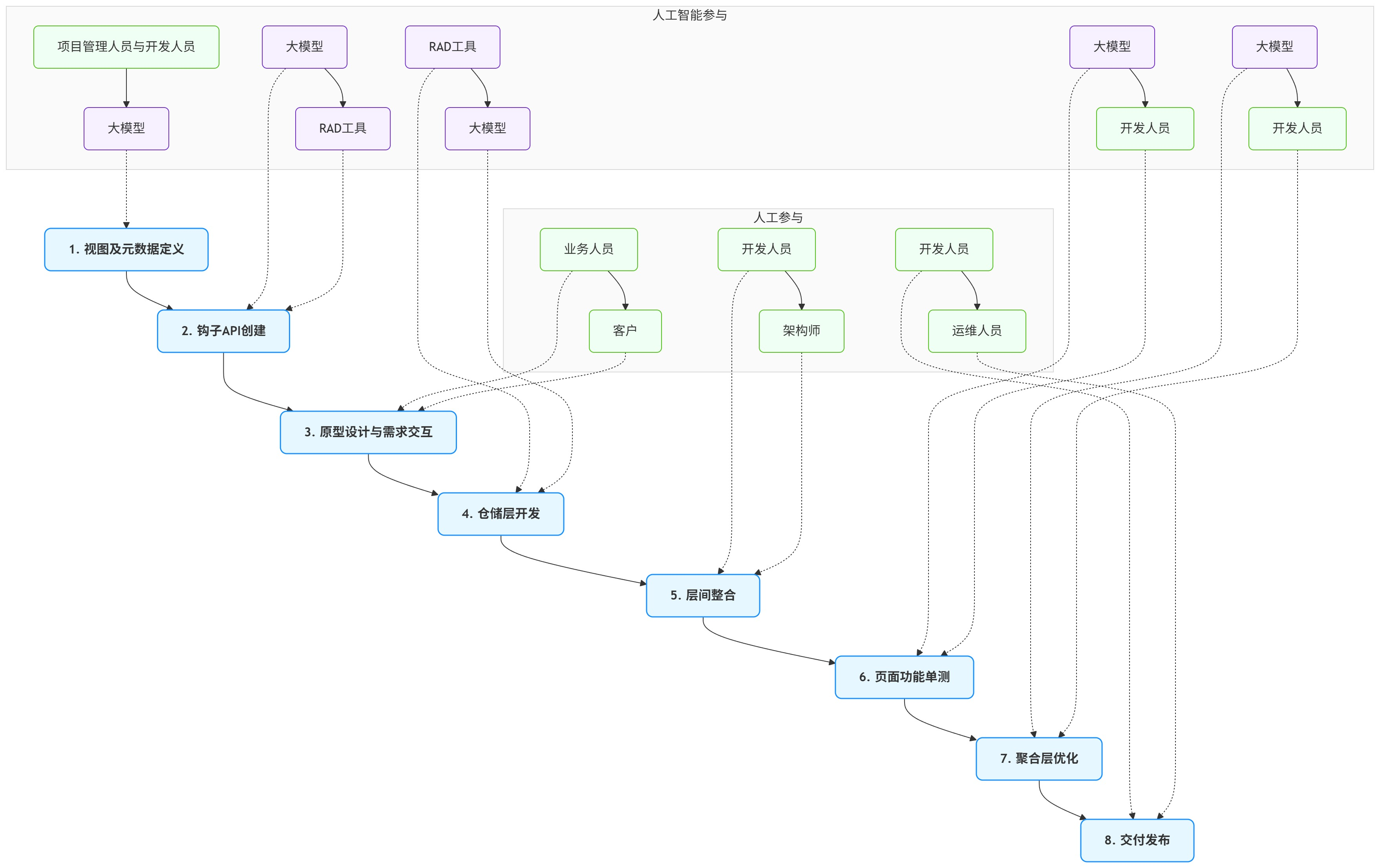 图形注解:1. 协同逻辑:人工角色与AI工具围绕架构层级分工协作,人工聚焦需求、审核、设计、运维等核心决策环节,AI工具聚焦代码生成、自动化构建等重复性工作;2. 重点协同:大模型主要支撑聚合层、仓储层的开发优化,RAD工具主要支撑视图层、聚合层的自动化构建;3. 价值体现:通过“人工决策+AI赋能”的协同模式,兼顾决策准确性与开发效率,适配企业级项目的复杂需求。