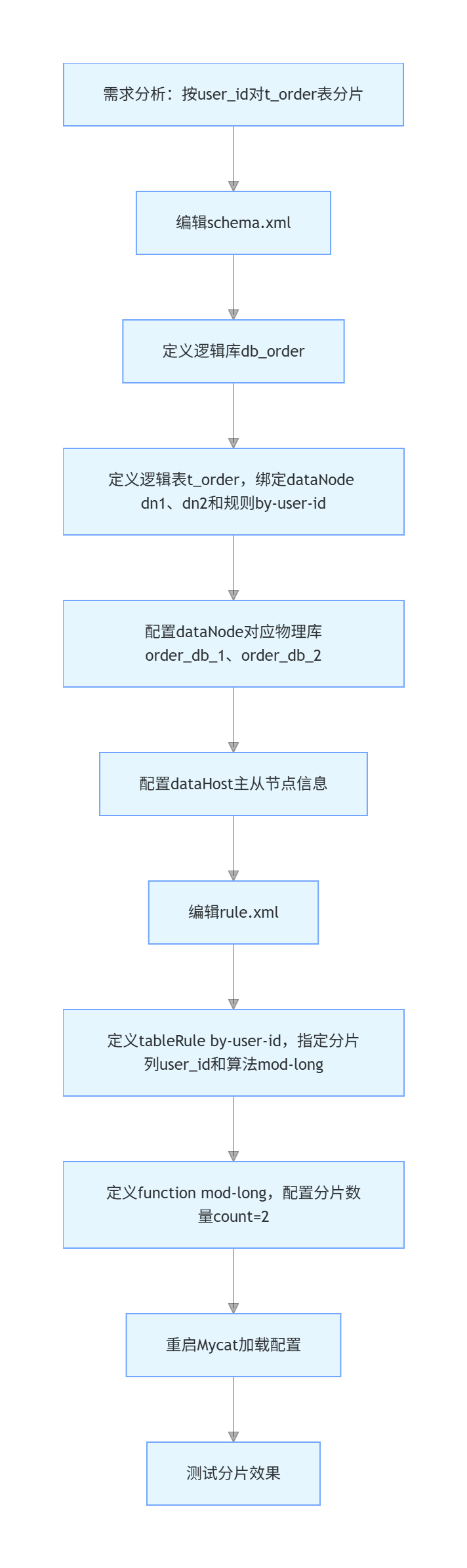 </mycat:schema>db。order,并指定了数据节点 dn1 和 dn2,以及分片规则 mod-long。mod-long 算法。PartitionByMod,表示按 user_id 取模分片。