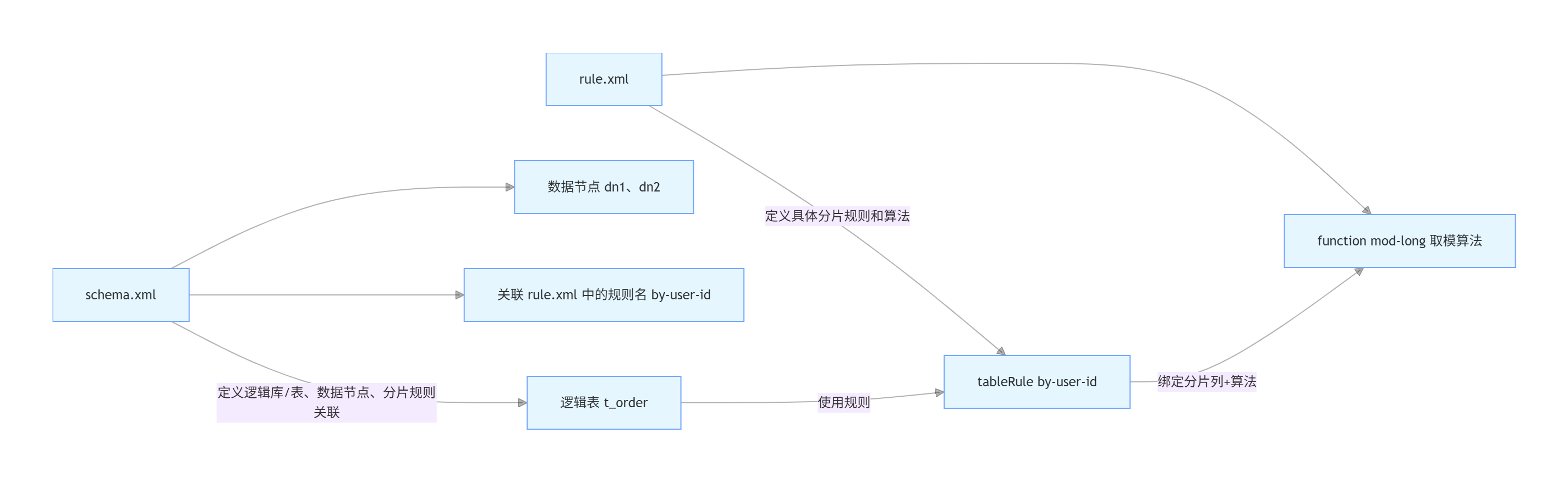 Mycat的配置主要通过几个XML文件完成,其中最重要的两个文件是schema.xml和rule.xml。