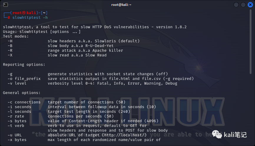 slowhttptest包含了之前几种慢攻击的攻击方式,包括slowloris, Slow HTTP POST, Slow Read attack等。那么这些慢攻击工具的原理就是想办法让服务器等待,当服务器在保持连接等待时,自然就消耗了资源。