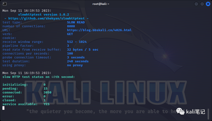 slowhttptest -c 1000 -H -i 10 -r 200 -t GET -u https://blog.bbskali.cn/index.html -x 24 -p 3
