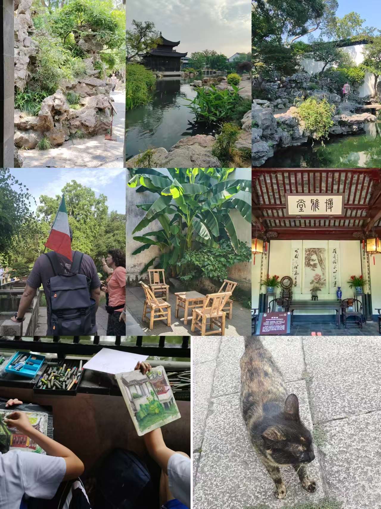 去了拙政园、狮子山、环秀山庄等几个园林。蹲着拍石缝里的青苔时,听见隔壁导游在说“一步一景”。后来坐在廊下发呆,旁边有学生写生,画板上是夏日的灰瓦白墙。