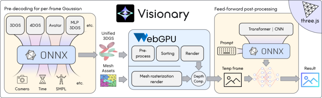 将各类 3DGS、4DGS 及 Avatar 方法统一导出为 ONNX 标准,每帧仅需输入相机、时间等轻量控制信号,即可由 ONNX 输出完整的高斯属性缓冲。