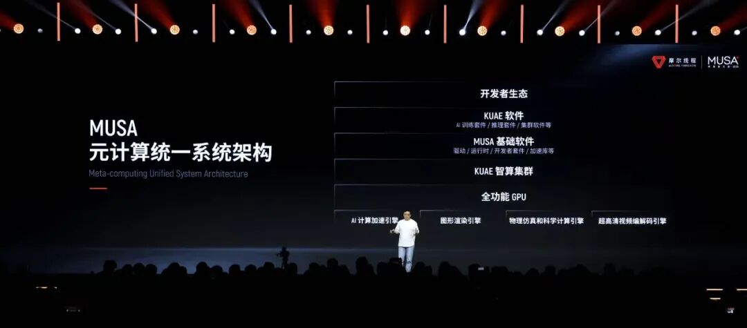 MUSA(Meta-computing Unified System Architecture)是摩尔线程自主研发的、覆盖从芯片架构、指令集、编程模型到软件运行库及驱动程序框架等的全栈技术体系。它是贯穿摩尔线程全栈产品体系的技术基石,相当于从软件到硬件所有产品的设计蓝图。