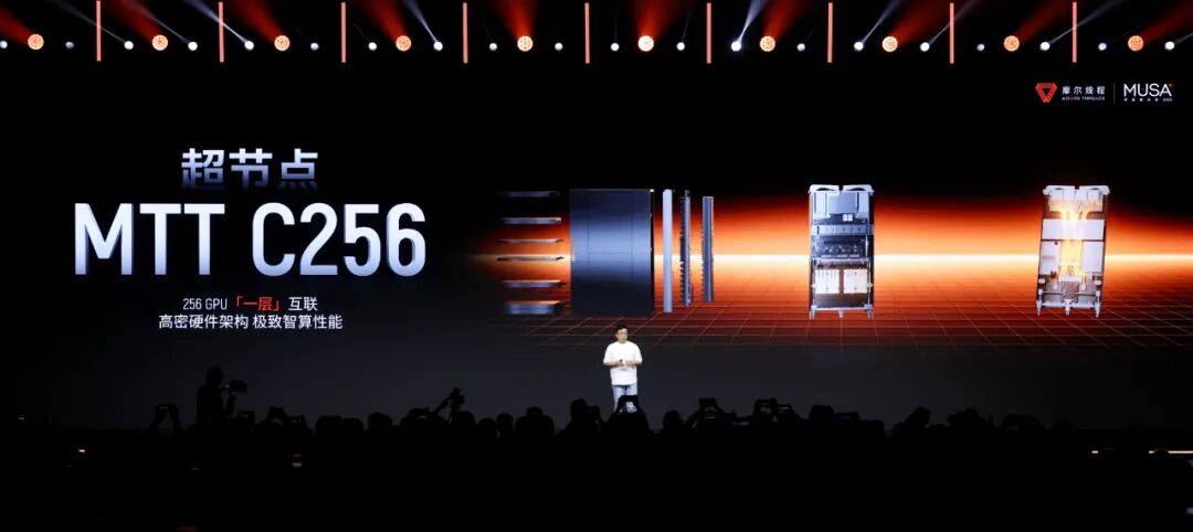 摩尔线程还计划推出超级节点产品 MTT C256,它能够以一层 scale up 网络实现两柜 256GPU 全互联,规避两层以上网络带来的带宽损失和额外延迟,大幅提高新型智算中心 GPU 部署密度。