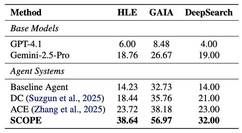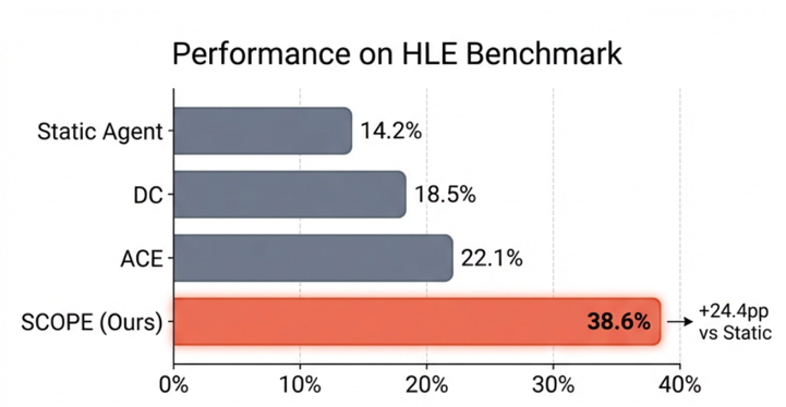 在 HLE 基准上,SCOPE 将任务成功率从 14.23% 提升到 38.64%。在 GAIA 基准上,成功率从 32.73% 提升到 56.97%。