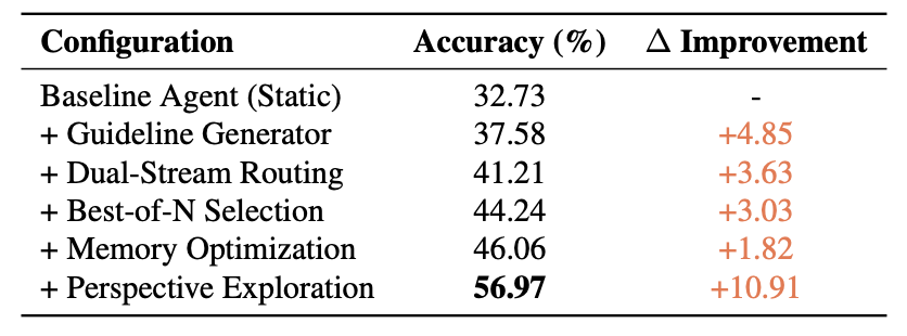 为了更准确地表达不同组件的贡献,论文中给出了消融实验。如下图所示,指导规则生成器提供 + 4.85% 的初始提升,双流路由贡献 + 3.63%,Best-of-N 选择贡献 + 3.03%,记忆优化贡献 + 1.82%,而视角驱动探索带来 + 10.91% 的提升。