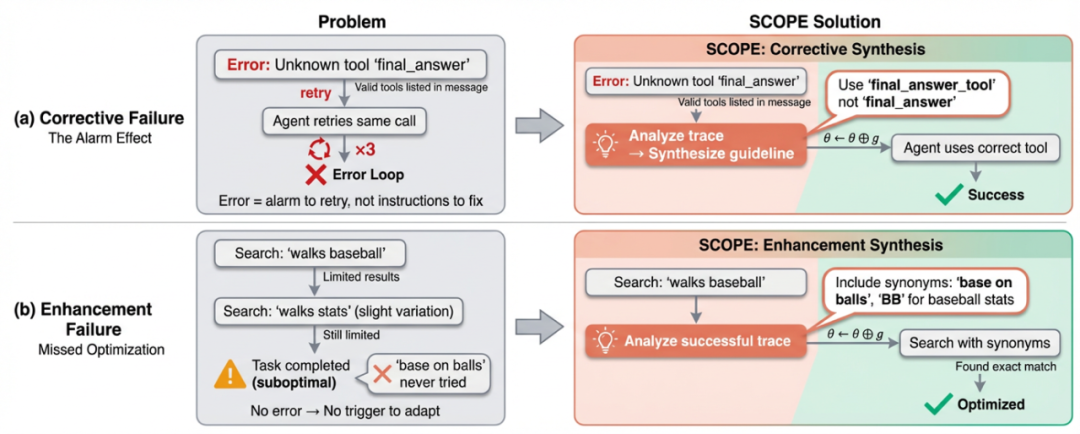 针对不同场景,SCOPE 使用两种合成模式:纠正型合成从错误中提取教训,增强型合成从成功模式中挖掘优化机会。实验表明,增强型规则占所有合成规则的 61%,说明 SCOPE 不仅仅是 “错误修复器”,更是一个主动的优化器。